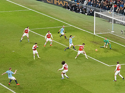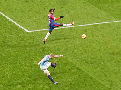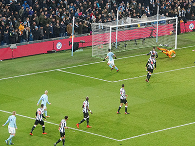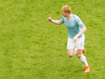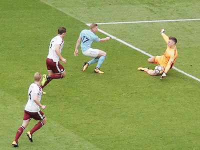 On 55 minutes De Bruyne in his 100th game grabs possession in midfield and charges down field before whipping over a tremendous pass to Jesus who cracks the ball first time past the keeper to make it 4-2