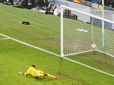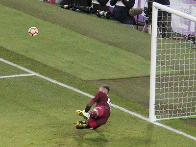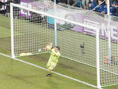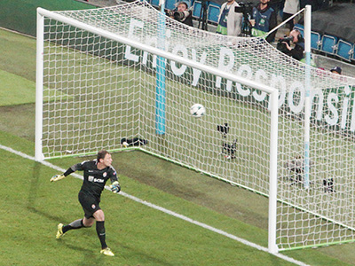 Kevin breaks down the left wing and smashes the ball.into the back of the net to make it two nil - Wonderful goal!