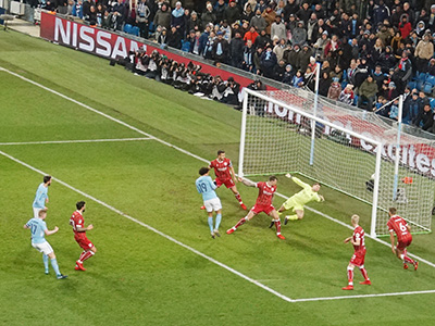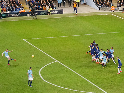 .Kevin shoots past Cech much to the delight to the City fans to give City an important lead
