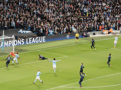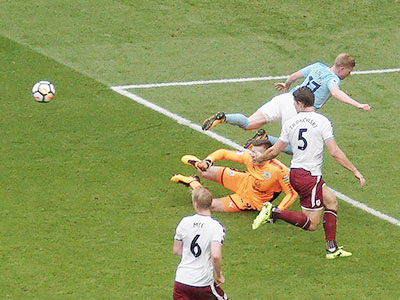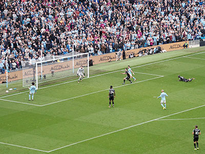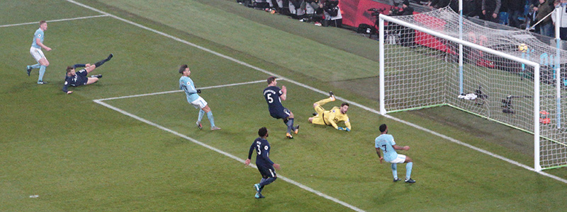 a cross from Kevin De Bruyne is glanced by Aguero into the bottom corner