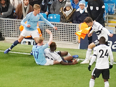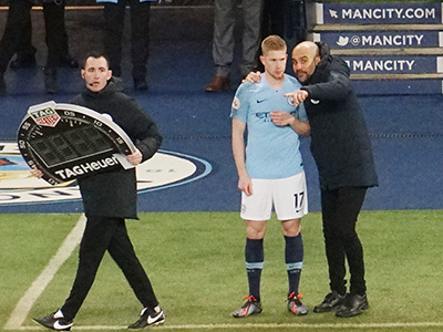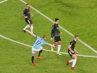 On 61 minutes City break and De Bruyne on for Mahrez takes a pass from Jesus and scores to make it three nil