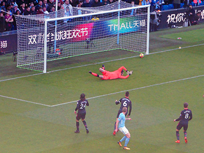 On 28 minutes De Bruyne shoots but Pope manages to block the shot. but the ball runs clear and Benardo Silva tries to get round Pope but is brought down and Aguero scores from the penalty