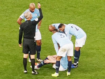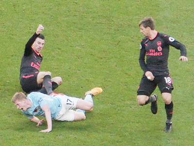Yet another yellow card for an Arsenal player Koscielny for the foul on De Bruyne