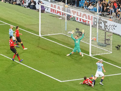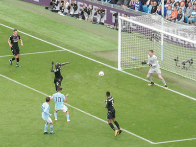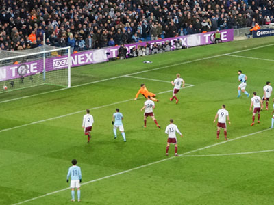 After 27 minutes Aguero heads past the keeper for his 100th goal at the Etihad