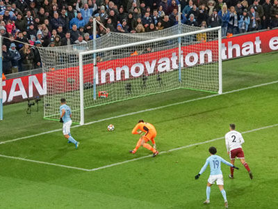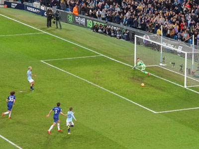 Aguero takes a pass from De Bruyne, rounds the keeper and shoots into an empty net
