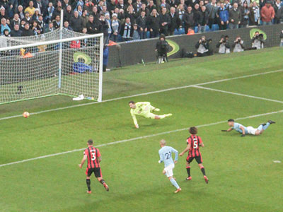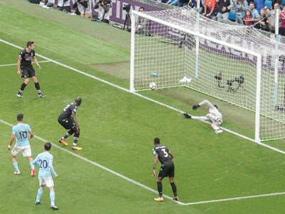 Aguero gets a cross from Silva and shoots past the keeper to give City the lead