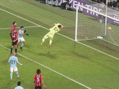 At a corner Gomes is unable to hold the ball and Aguero is nearby to poke it in the net