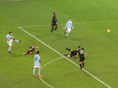 On 13 minutes Aguero shoots from outside the area and the ball flies into the top corner of the goal