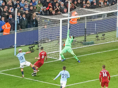 Sergio shoots his 250th goal for City from a cross from Jesus