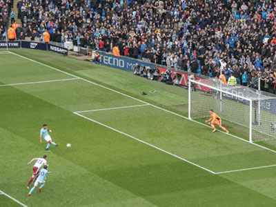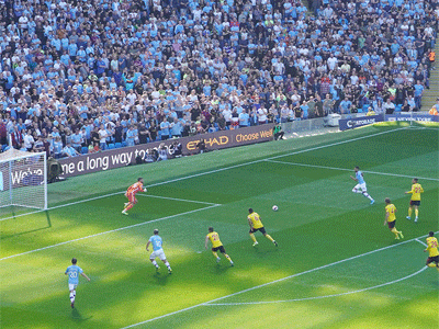 On 40 minutes Sergio gets the ball from Benardo and cracks the ball past the keeper to give City the lead.