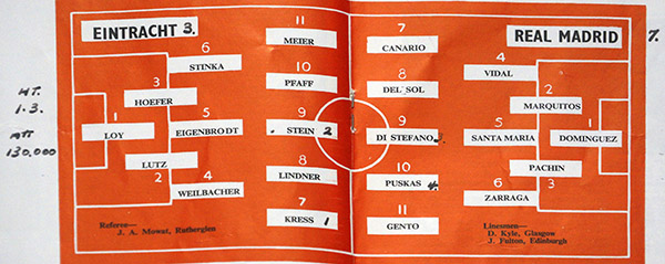 During the World Cup news came through that Alfredo Di Stefano had died. aged 88. I was fortunate enough to see him play on two occasions - first was at Hampden along with 127,000 others in the European Cup Final between Real Madrid and Eintracht Frankfurt in May 1960 . Real Madrid won 7-3 Stefano scoring a hat-trick - Puskas scored the other 4. The program is below.