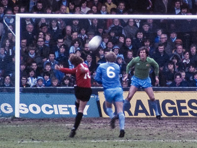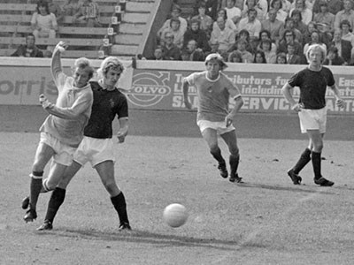 Bell watches Law trying to break through against Burnley in 1973 in the Charity Shield Final at Maine Road