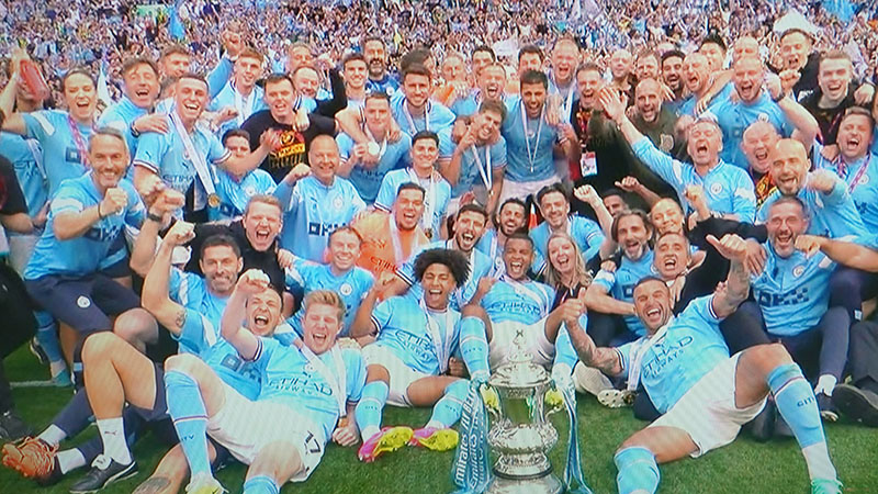 There was an extraordinary start to the game. The kickoff pass was put back to Ortega who banged it up field towards Haaland. The ball then went to a dual between De Bruyne and Lindelof and finally the ball got to Gundogan on the edge of the area who volleyed the ball into the net in just 12 seconds - the fastest ever in a FA Cup Final. Incredible !! I wonder how many City fans missed it!