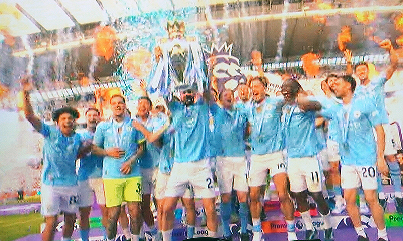 On 67 minutes a pass by Benardo finds Haaland on his own just in the City half. He charges forward and shoots past the keeper to make it three nil - game over !!!!!!