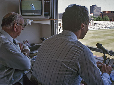 an older Brian Johnson with David Lloyd in the test Match Special box at Old Trafford 1992