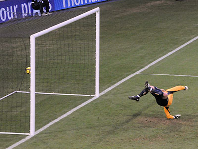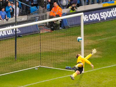 Connelly scores from the spot beating Weaver to give Wimbledon the lead after twenty odd minutes