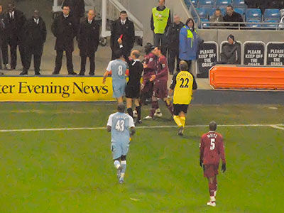 With only a few minutes to go Joey Barton was sent off by referee Riley following an altercation with Faye