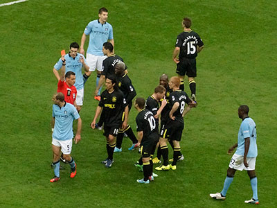 Zabaleta gets a red card on 83 minutes for a second yellow!