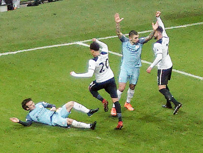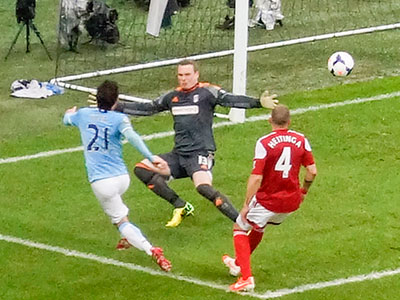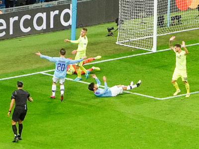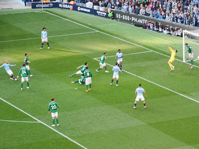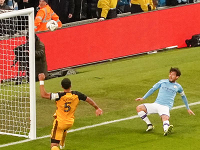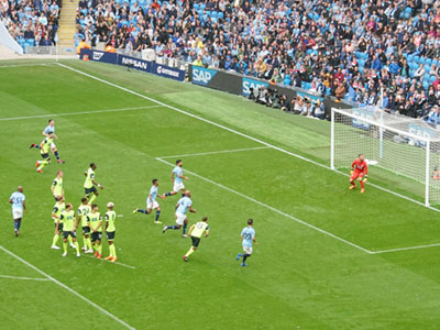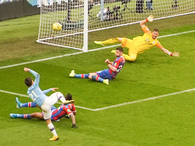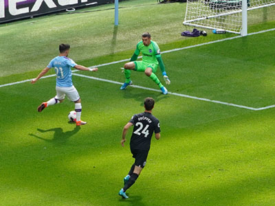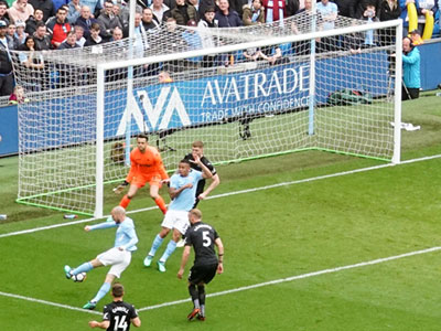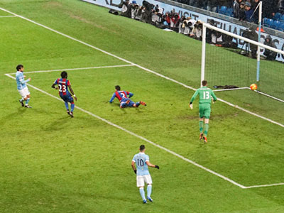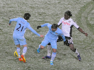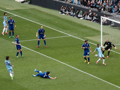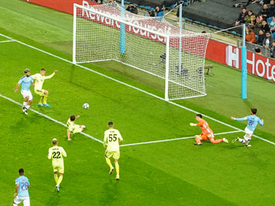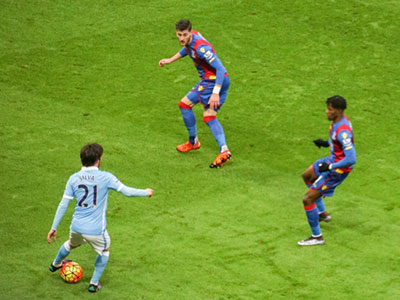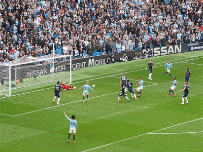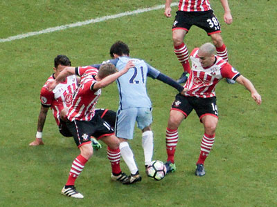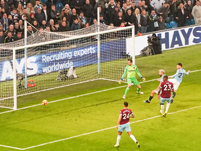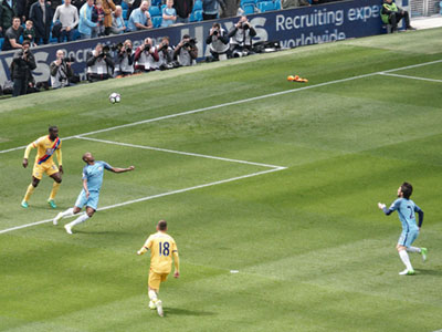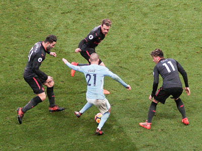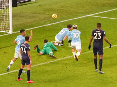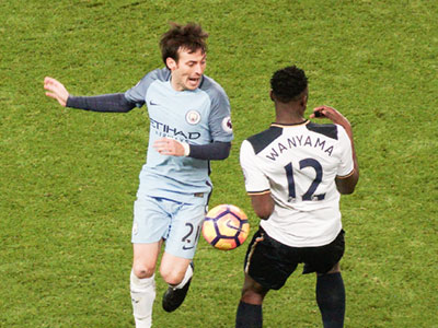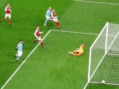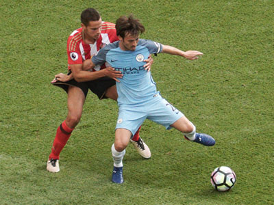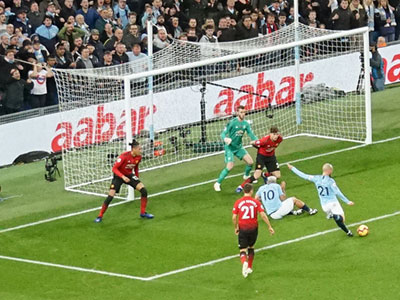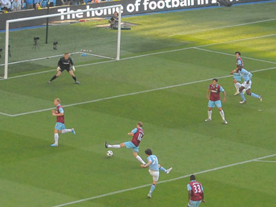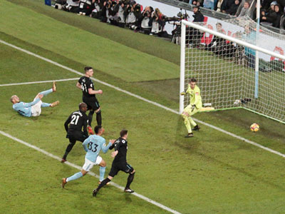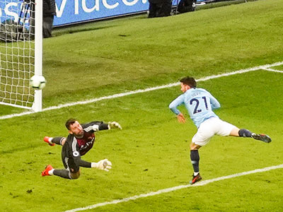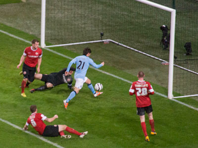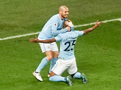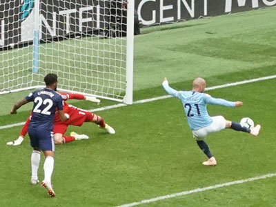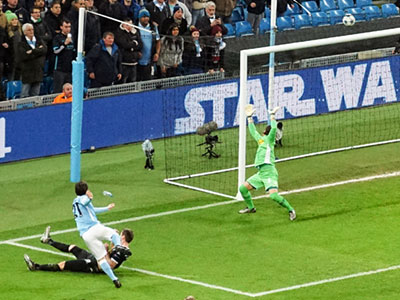 right near the final whistle Silva takes a pass from Aguero and makes it four nil
