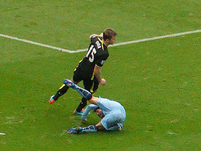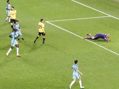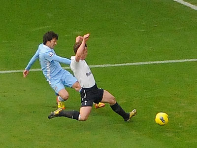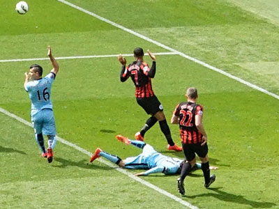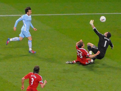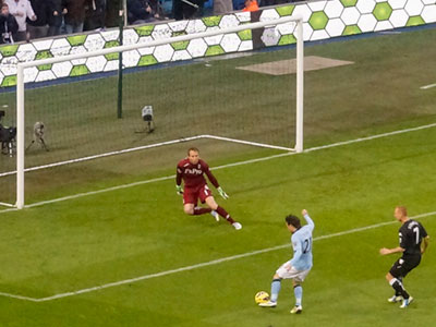 Kaboul brings down Silva in the penalty area but Aguero fails to score from his second penalty kick