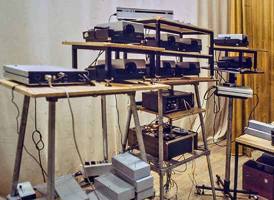 An earlier setup can be seen left. A four track tape deck was used for the sound and while the Diafade controlled the centre 4, a pair of ES69's controlled the outer 4.